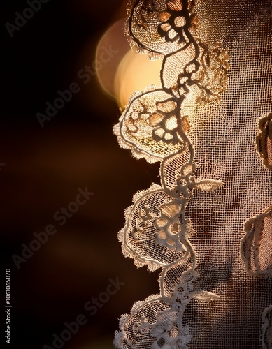 Intricate lace pattern illuminated by warm light, casting delicate shadows.