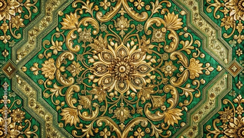 Intricate Tapestry of Geometric Patterns in Emerald Green and Gold with Baroque Accents