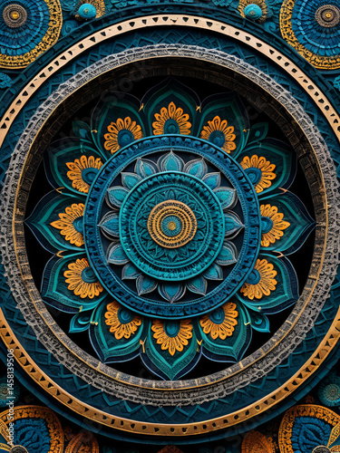 Intricate, vibrant mandalas and sacred geometry patterns adorn ancient temple walls, radiating spiritual energy and mysticism in this stunning, high-contrast, fine-art photograph.
