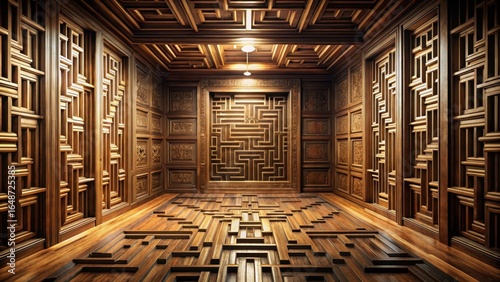Intricate Wooden Room Design Featuring Geometric Paneling and Labyrinthine Flooring