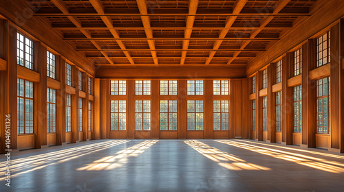 interior, roomy, sunlit, hall, intricate, wooden, waffle, ceiling, delicate, pattern, inviting, serene, atmosphere, tranquil, perspective, light, design, architectural, building, empty, room, wall, construction