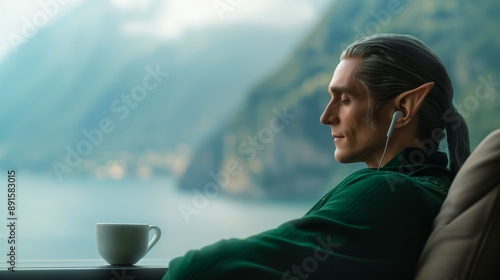 intro for a podcast about music, an elf in a green suit listens to music, a view of the bay and rocks, a cup of tea on the table