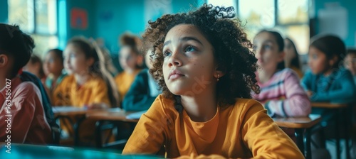 Introspective Young Girl in Classroom Setting Surrounded by Classmates - Educational Isolation Concept