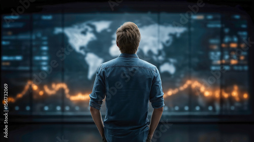 Investor analyzing global markets on large holographic screen with glowing world maps and graphs, neon accents, dark background