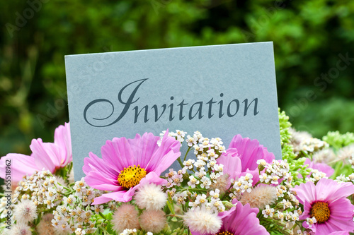invitation, green, flower, smell, scented, beauty, gift, present, bouquet, summer, wood, birthday, wedding, gift card, card, paper, grey, pink, blue, red, leaf, sedum, yarrow, cosmos, english, writing, text, lettering