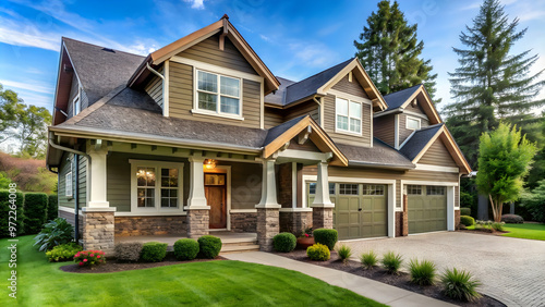 Inviting green home with stone facade, nestled in a serene landscape. Tranquil two-story residence featuring green siding and stone accents.