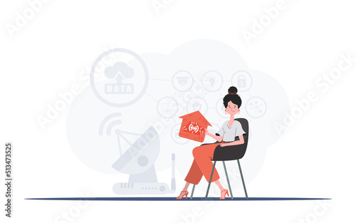 IoT concept. The girl sits in a chair and holds an icon of a house in her hands. Good for presentations. Vector illustration in flat style.