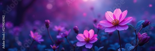 Iridescent flowers blooming amidst a deep indigo and magenta misty environment, indigo flowers, nature, magenta