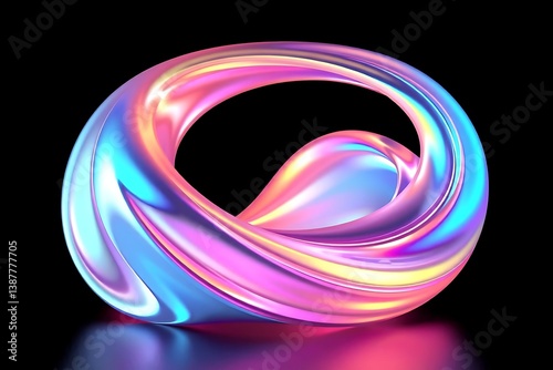 iridescent, flowing, ring, sculpture, black background, abstract, digital artwork, modern, design, art, smooth, shiny, colourful, glossy, reflective, curve, swirl, looped, metallic, futuristic, holographic, fluid, geometric, shape, form, gradient, rainbow, high-coloured, chroma, refraction, light, surface, texture, illustration, artwork, decorative, design element, object, nobody, render, three-dimensional, studio shot, artistic, vibrant, elegant, sculpted