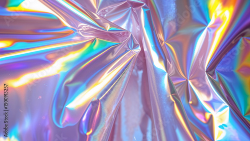 Iridescent holographic wrinkled foil creating colorful background with vivid colors