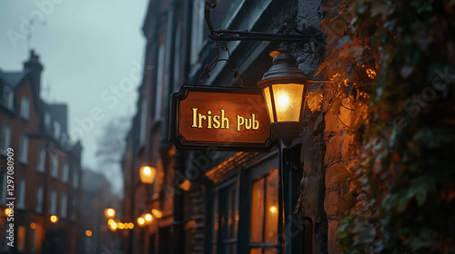 Irish pub sign on a historic street at night. St. Patrick’s Day theme