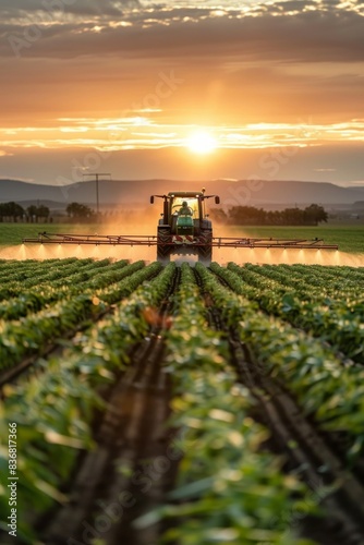 Irrigation tractor tending agricultural crop sunset Banner design integrates infographic data