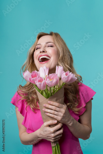 flower, smell, tulip, spring, racked, woman, bouquet, smile, hold, cute, girl, young, happy, beautiful, caucasian, springtime, beauty, cheerful, portrait, freshness, lady, fashion, dress, female, coiffure, celebration, concept, stylish, gift, youth, gentle, floral, plant, care, pink, isolated, bright, enjoyment, adult, love, 1, holiday, elegant, amazing, attractive, glamour, colourful, adorable, pretty, nature