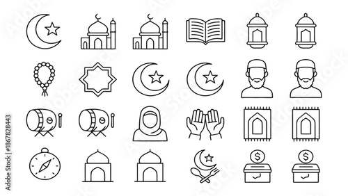 Islamic symbols and icons including mosques crescent moons stars lanterns prayer beads and hands in prayer on white