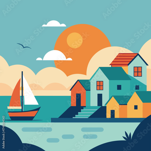 house, landscape, vector, home, illustration, city, sky, village, town, building, nature, cartoon, tree, architecture, summer, design, hill, grass, house, cloud, sun, icon, green, cloud, street