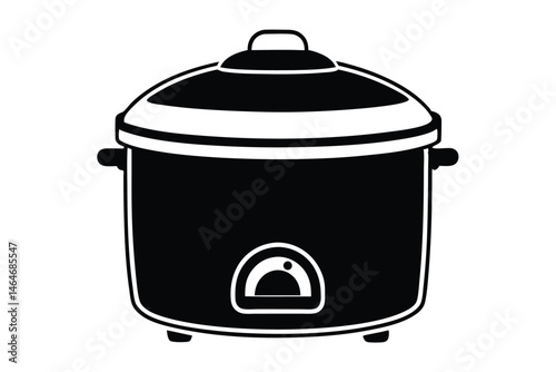 Isolated black and white cooker has a lid and handles over white background