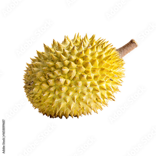 Isolated durian fruit Yellow spiky skin brown stem Southeast Asian delicacy with pungent aroma unique flavor