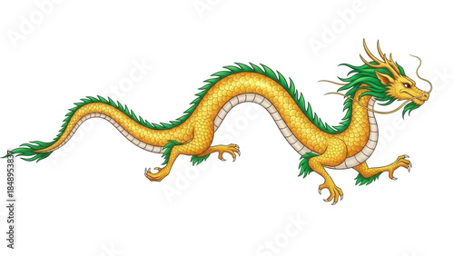 Isolated golden Chinese dragon with green accents, mythical creature in motion, side view