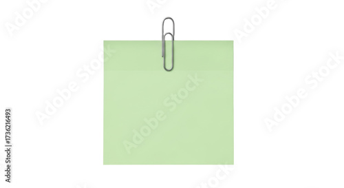 Isolated green note with paper clip, memo on green sheet, communication equipment tool