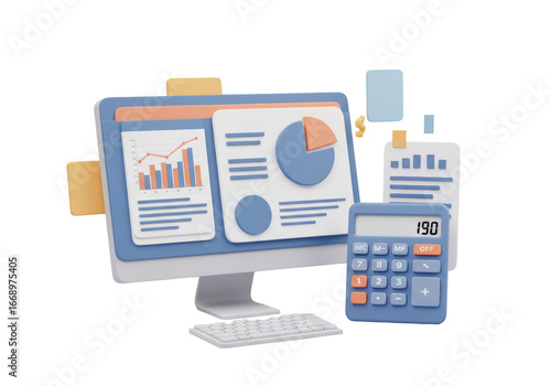 Isolated illustration of a computer screen displaying data charts, accompanied by a calculator showing '190', representing financial analytics and business calculations with a clean, organized design