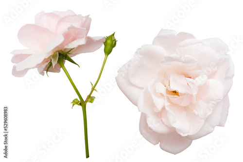 Isolated light pink roses flowers on white background. Bud and leaf of light pink rose flower isolated on white. Tea rose. Aroma rose flowers