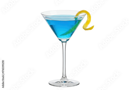 Isolated martini glass of blue liquid with citrus twist; cocktail is ready to serve