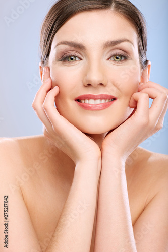 face, woman, isolated, beauty, beautiful, skin, portrait, white, girl, care, model, young, female, background, hand, clean, fresh, studio, natural, honed, spa, healthy, health, attractive, smile, pretty, caucasian, brunette, facial, people, skincare, 1, person, youth, hair