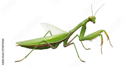 Isolated praying mantis insect close-up, a green ambush predator with spiky forelegs and antennae