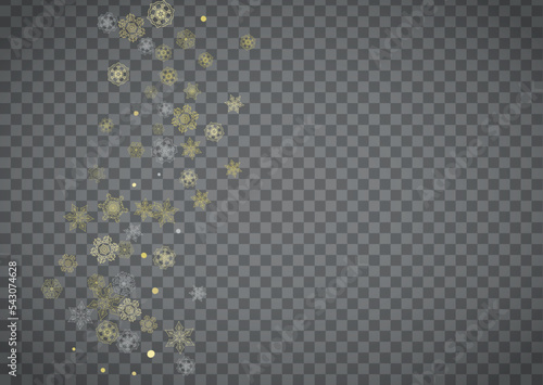 Isolated snowflakes on horizontal transparent grey background. Gold glitter snow. Winter sales, Christmas and New Year design for party invitation, banner, sale. Magic crystal isolated snowflakes.