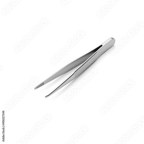 Isolated stainless steel tweezers, precision grip, minimalist white background, medical tool.