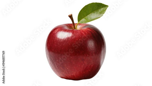 Isolated vibrant red apple with a crisp green leaf and natural stem, fresh juicy fruit