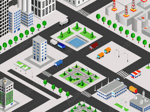 Isometric cityscape illustration featuring buildings roads and various vehicles