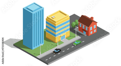 city, urban, isometric, building, architecture, skyscraper, office, house, residential, commercial, modern, traditional, street, road, car, vehicle, tree, green, landscape, scene, illustration, graphic, design, art, digital, cartoon, stylised, miniature, model, diorama, perspective, aerial, view, block, neighbourhood, district, downtown, suburb, development, construction, real estate, property, housing, business, corporate, home, dwelling, infrastructure, transport