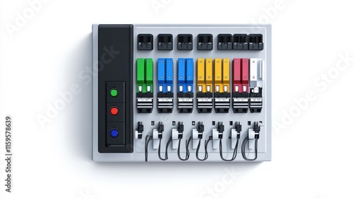 Isometric electrical panel with contactors and fuses Automatic circuit breakers isolated on white background Electric fuse design