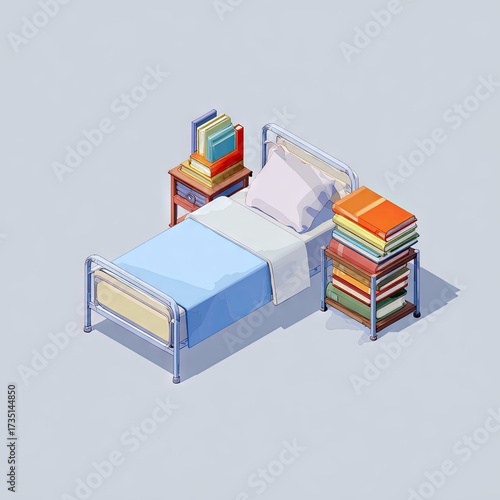 bed, nightstand, book, stack, isometric, illustration, bedchamber, furniture, reading, education, learning, study, rest, pillow, blanket, blue, white, yellow, red, green, orange, wooden, table, design, graphic, art, vector, isolated, concept, minimalist, modern, simple, composition, perspective, background, copy space, digital, creative, element, image, visual, scene, library, cognition, interior, decor, style