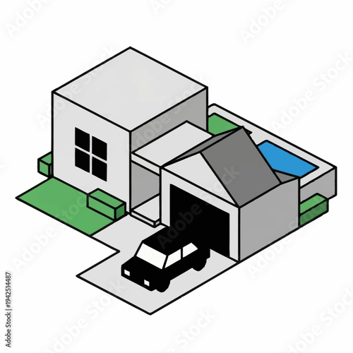 house, home, isometric, illustration, modern, architecture, garage, swimming, pool, building, dwelling, residence, property, real, estate, design, style, structure, graphic, vector, art, concept, idea, blueprint, schematic, diagram, layout, plan, model, three-dimensional, perspective, view, angle, projection, rendering, visualisation, representation, image, picture, scene, setting, environment, surrounding, landscape, background, simple, minimalist, clean