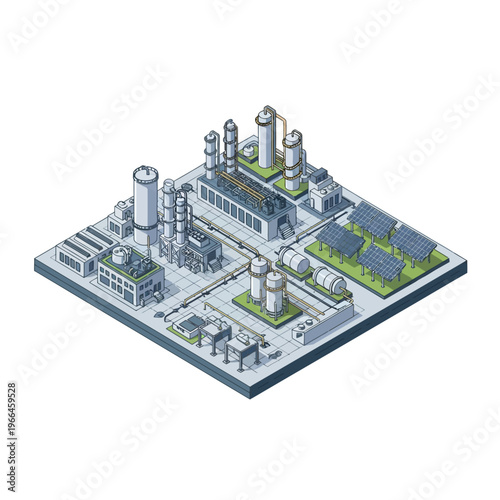 Isometric illustration of a modern industrial complex featuring a chemical plant, solar panels, and storage facilities, representing sustainable energy and manufacturing.