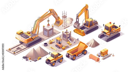 isometric, illustration, construction, equipment, material, shoveling, machinery, build, heavy, industry, urban, landscape, dump truck, project, backhoe, design, machine, gravel, drill, zone, city, vest, high, graphic, concrete, shoveling, progress, loader, job