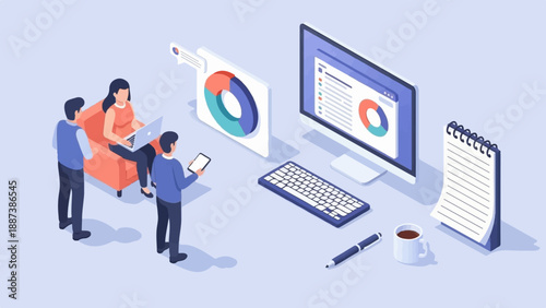 isometric, illustration, business, collaboration, teamwork, datum, chart, graph, pie, chart, computer, monitor, keyboard, laptop, tablet, phone, notebook, notepad, pen, hot drink, cup, drink, office, desk, workspace, meeting, discussion, strategy, planning, research, progress, development, growth, success, project, management, digital, technology, infographic, design, graphic, vector, modern, visual, presentation, concept, corporate
