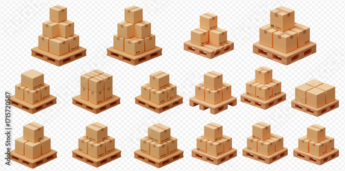Isometric illustration showcasing various stacks of cardboard boxes arranged on wooden pallets, presented against a transparent background.