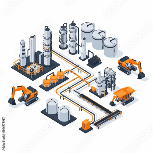 isometric, industrial, complex, refinery, oil, mining, equipment, pipeline, factory, production, manufacturing, industry, shoveling, dump, truck, storage, tank, chemical, plant, energy, crude oil, gas, fuel, extraction, processing, infrastructure, machinery, construction, engineering, heavy, power, generation, resource, raw, material, logistic, transportation, distribution, supply, chain, automation, technology, modern, industrialization, development, global, economy, business, operation