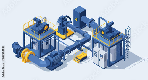industrial, factory, production, machinery, robotic, automation, manufacturing, assembly, technology, engineering, system, plant, equipment, process, pipeline, conveyer, arm, robot, automated, modern, isometric, digital, illustration, graphic, vector, blue, yellow, metal, steel, structure, unit, module, control, panel, work, flow, efficiency, innovation, future, industry, smart, precision, mechanical, complex, network, connected, operation, facility, enterprise