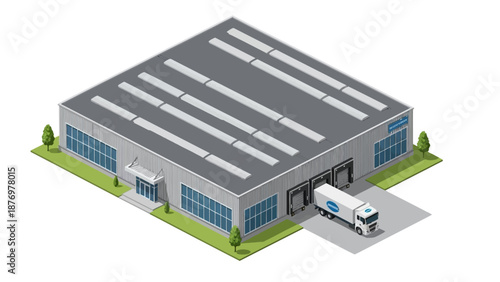 Isometric modern industrial warehouse facility featuring a delivery truck at the loading dock, representing efficient logistics, storage, and global supply chain management