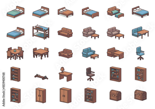 furniture, pixel, art, isometric, game, asset, decoration, diverse, selection, detailed, chest, resource, bookshelf, element, living, asset, group, essential, setting, cabinet, dining, dresser, theme, graphic, office, room, sofa, builder, component, layout, stool, display, item, couch, development, various, clothes rack, armchair, desk, virtual