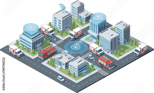 emergency services, isometric, connectivity, ambulance, fire engine, technology, network, signal, datum, infrastructure, architecture, building, telecom, public safety, wireless, automation, communication, navigation, dispatch, system, flow, innovation, vector, management, monitoring, rescue, traffic, intersection, street, map, blueprint, connection, satellite, artificial intelligence, city life, modern, service