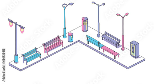 isometric, park, urban, pastel, bench, street, lamp, trash, bin, illustration, city, design, public, area, modern, architecture, bench, lighting, environment, colourful, arrangement, sidewalk, seating, infrastructure, minimalist, graphic, clean, artistic, layout, geometric, vibrant, simple, tranquil, recreational