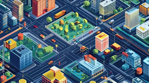 city, city landscape, building, building, skyscraper, skyscraper, road, road, street, street, intersection, vehicle, vehicle, car, car, truck, bus, bus, traffic, park, park, tree, grass, sidewalk, sidewalk, lamp-post, light, light, asphalt, concrete, blue, yellow, orange, green, grey, white, line, design, illustration, isometric, perspective