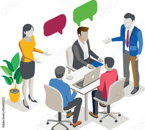 isometric, meeting, team, office, plant, modern, discussion, collaboration, business, people, laptop, chair, table, communication, corporate, workspace, strategy, planning, presentation, brainstorming, co-worker, professional, dialogue, idea, innovation, project, design