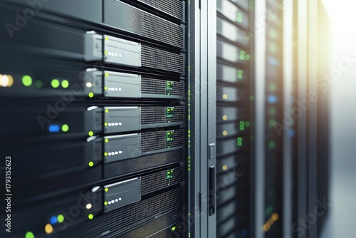 IT server racks with illuminated drive bays and detailed mesh panels in a modern data center, ideal for IT presentations, infrastructure visuals and technology backgrounds