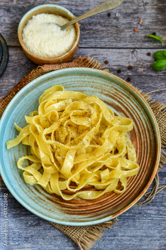 Italian food . Fresh home made tagliatelle vegetarian egg pasta with ,parmesan cheese ,fresh parsley and black pepper.Pasta cacio e pepe